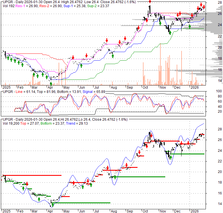Price has closed below its short-term moving average. Short-term moving average is currently above mid-term; and above long-term moving average. From the relationship between price and moving averages: This stock is NEUTRAL in short-term; and BULLISH in mid-long term.[ UPGR ] has closed above bottom band by 48.3%. Bollinger Bands are 42.7% narrower than normal. The narrow width of the bands suggests low volatility as compared to its normal range. The bands have been in this narrow range for 0 bars. This is a sign that the market may be about to initiate a new trend.