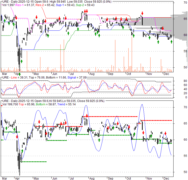 Price has closed above its short-term moving average. Short-term moving average is currently below mid-term; and below long-term moving average. From the relationship between price and moving averages: This stock is NEUTRAL in short-term; and BEARISH in mid-long term.[ URE ] has closed above bottom band by 42.8%. Bollinger Bands are 23.8% narrower than normal. The current width of the bands does not suggest anything about the future direction or movement of prices.