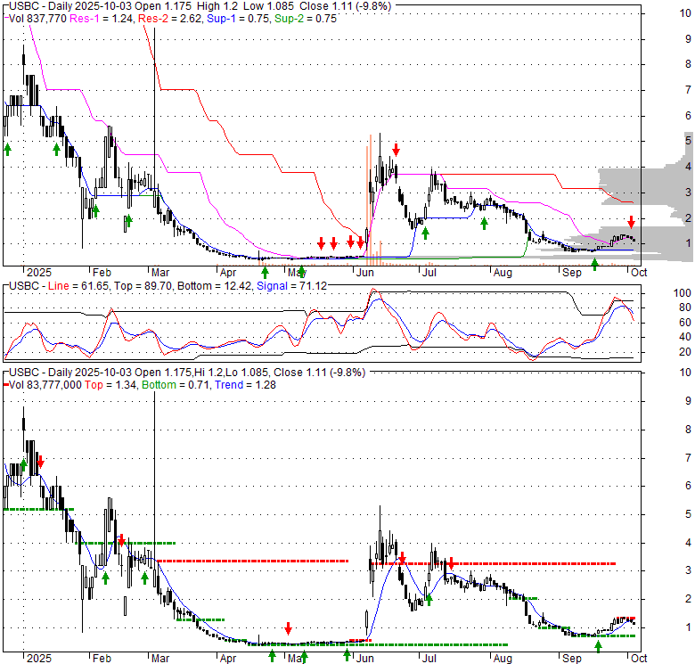 Price has closed below its short-term moving average. Short-term moving average is currently below mid-term; and below long-term moving average. From the relationship between price and moving averages: This stock is BEARISH in short-term; and BEARISH in mid-long term.[ USBC ] has closed below upper band by 43.0%. Bollinger Bands are 49.6% narrower than normal. The narrow width of the bands suggests low volatility as compared to its normal range. The bands have been in this narrow range for 19 bars. This is a sign that the market may be about to initiate a new trend.