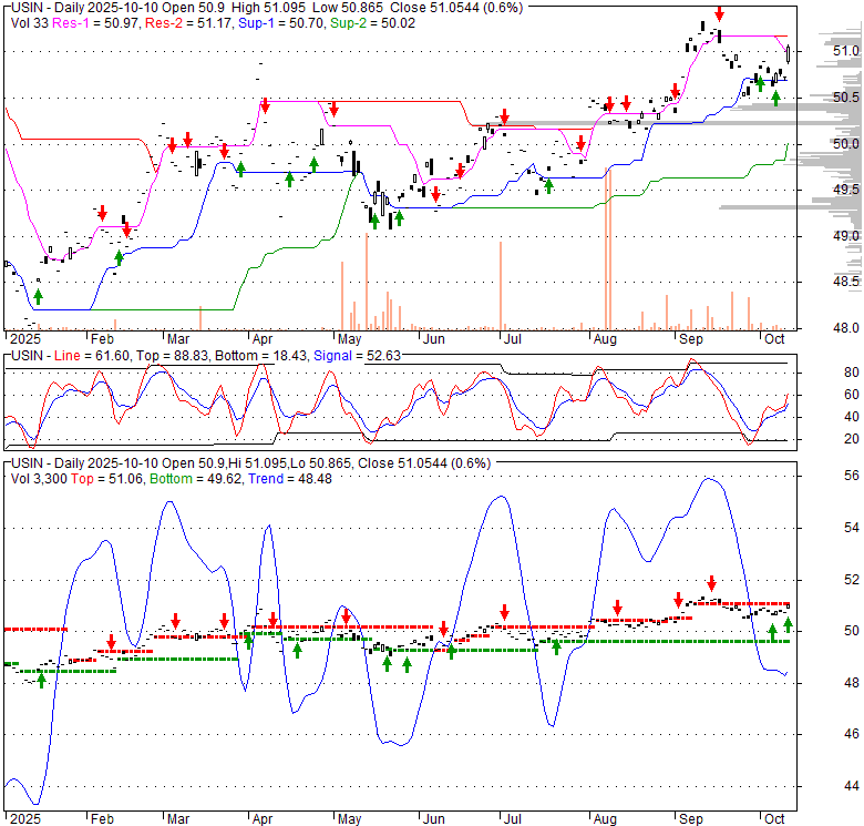 Price has closed above its short-term moving average. Short-term moving average is currently above mid-term; and above long-term moving average. From the relationship between price and moving averages: This stock is BULLISH in short-term; and BULLISH in mid-long term.[ USIN ] has closed Bollinger Bands are 34.3% narrower than normal. The current width of the bands does not suggest anything about the future direction or movement of prices.