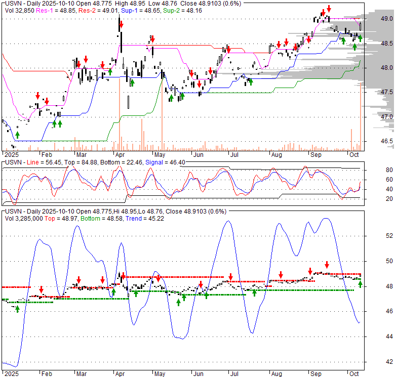 Price has closed above its short-term moving average. Short-term moving average is currently above mid-term; and above long-term moving average. From the relationship between price and moving averages: This stock is BULLISH in short-term; and BULLISH in mid-long term.[ USVN ] has closed It is unclear right now based on current values. 49.6% narrower than normal. The narrow width of the bands suggests low volatility as compared to its normal range. The bands have been in this narrow range for 3 bars. This is a sign that the market may be about to initiate a new trend.
