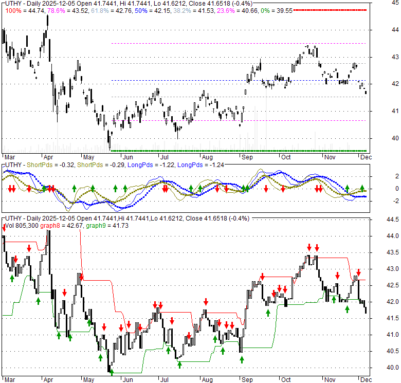 Price has closed below its short-term moving average. Short-term moving average is currently below mid-term; and below long-term moving average. From the relationship between price and moving averages: This stock is BEARISH in short-term; and NEUTRAL in mid-long term.[ UTHY ] has closed above bottom band by 7.7%. Bollinger Bands are 11.1% narrower than normal. The current width of the bands does not suggest anything about the future direction or movement of prices.