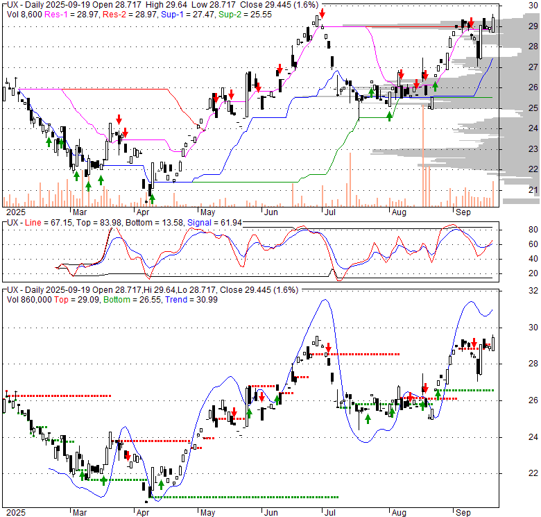 Price has closed below its short-term moving average. Short-term moving average is currently above mid-term; and above long-term moving average. From the relationship between price and moving averages: This stock is NEUTRAL in short-term; and BULLISH in mid-long term.[ UX ] has closed above bottom band by 47.9%. Bollinger Bands are 17% wider than normal. The current width of the bands does not suggest anything about the future direction or movement of prices.