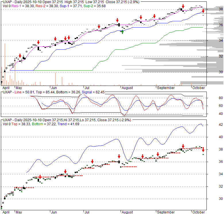 Price has closed below its short-term moving average. Short-term moving average is currently above mid-term; and above long-term moving average. From the relationship between price and moving averages: This stock is NEUTRAL in short-term; and BULLISH in mid-long term.[ UXAP ] has closed below the lower bollinger band by 7.7%. Although price has broken the lower band and a downside breakout is possible; the most likely direction for [ UXAP ] is to continue within current trading range. Bollinger Bands are 6.6% narrower than normal. The current width of the bands does not suggest anything about the future direction or movement of prices.