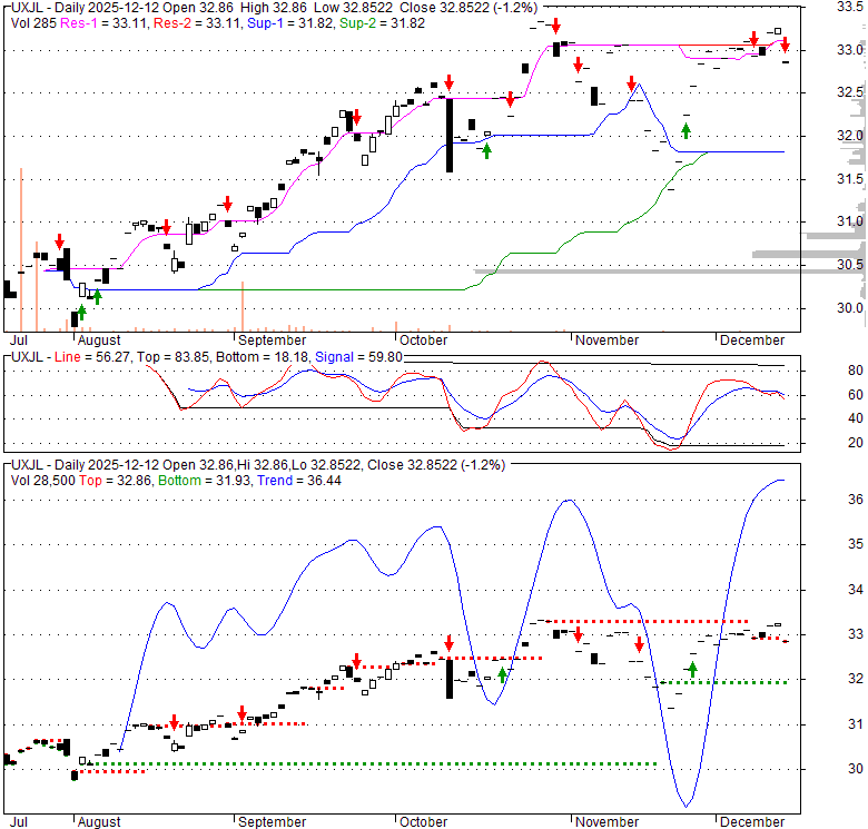 Price has closed below its short-term moving average. Short-term moving average is currently above mid-term; and above long-term moving average. From the relationship between price and moving averages: This stock is NEUTRAL in short-term; and BULLISH in mid-long term.[ UXJL ] has closed below upper band by 48.2%. Bollinger Bands are 0% narrower than normal.