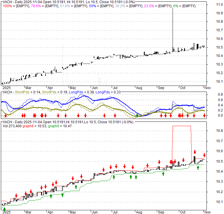 Price has closed above its short-term moving average. Short-term moving average is currently above mid-term; and above long-term moving average. From the relationship between price and moving averages: This stock is BULLISH in short-term; and BULLISH in mid-long term.[ VACH ] has closed below upper band by 26.9%. Bollinger Bands are 43.4% wider than normal. The large width of the bands suggest high volatility as compared to its normal range. The bands have been in this wide range for 10 days. This is a sign that the current trend might continue.