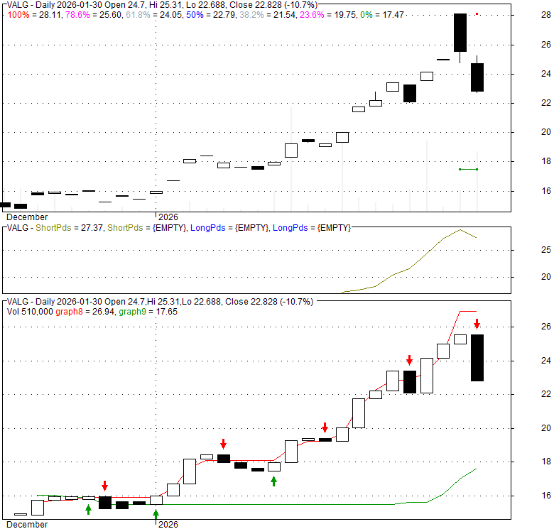 Price has closed below its short-term moving average. Short-term moving average is currently below mid-term; and below long-term moving average. From the relationship between price and moving averages: This stock is NEUTRAL in short-term; and NEUTRAL in mid-long term.[ VALG ] has closed below upper band by 34.3%. Bollinger Bands are 0% narrower than normal.