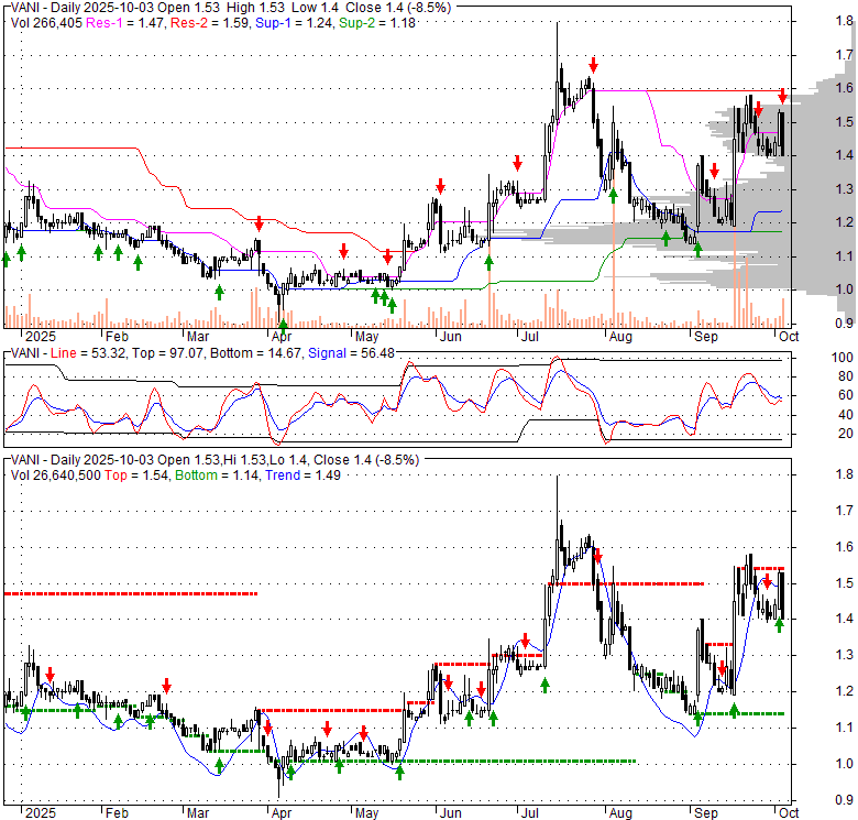 Price has closed below its short-term moving average. Short-term moving average is currently above mid-term; and above long-term moving average. From the relationship between price and moving averages: This stock is NEUTRAL in short-term; and BULLISH in mid-long term.[ VANI ] has closed above bottom band by 42.8%. Bollinger Bands are 16.8% wider than normal. The current width of the bands does not suggest anything about the future direction or movement of prices.