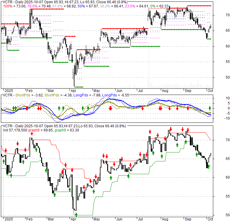 Price has closed above its short-term moving average. Short-term moving average is currently below mid-term; and below long-term moving average. From the relationship between price and moving averages: This stock is NEUTRAL in short-term; and NEUTRAL in mid-long term.[ VCTR ] has closed below upper band by 38.1%. Bollinger Bands are 4.8% narrower than normal. The current width of the bands does not suggest anything about the future direction or movement of prices.