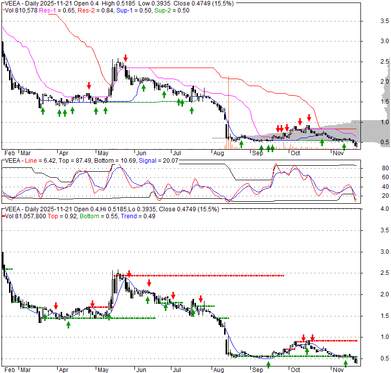 Price has closed below its short-term moving average. Short-term moving average is currently below mid-term; and below long-term moving average. From the relationship between price and moving averages: This stock is BEARISH in short-term; and BEARISH in mid-long term.[ VEEA ] has closed above bottom band by 13.1%. Bollinger Bands are 53.1% narrower than normal. The narrow width of the bands suggests low volatility as compared to its normal range. The bands have been in this narrow range for 9 bars. This is a sign that the market may be about to initiate a new trend.
