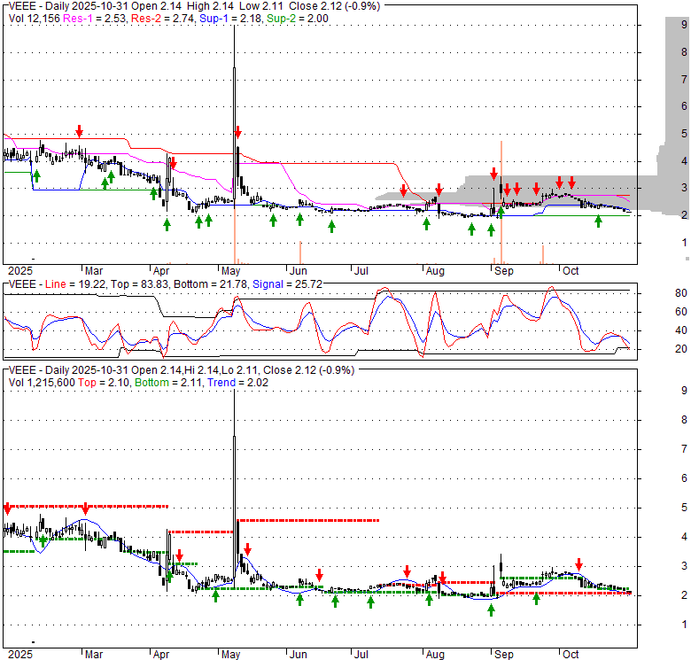 Price has closed below its short-term moving average. Short-term moving average is currently below mid-term; and below long-term moving average. From the relationship between price and moving averages: This stock is BEARISH in short-term; and NEUTRAL in mid-long term.[ VEEE ] has closed above bottom band by 7.4%. Bollinger Bands are 19.8% narrower than normal. The current width of the bands does not suggest anything about the future direction or movement of prices.
