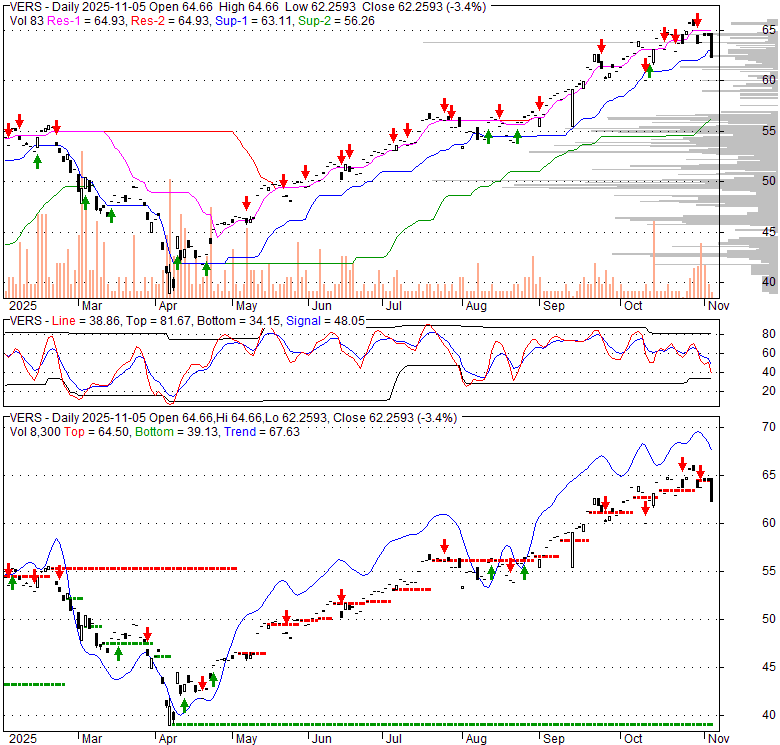 Price has closed below its short-term moving average. Short-term moving average is currently above mid-term; and above long-term moving average. From the relationship between price and moving averages: This stock is NEUTRAL in short-term; and BULLISH in mid-long term.[ VERS ] has closed above bottom band by 0.8%. Bollinger Bands are 10.3% narrower than normal. The current width of the bands does not suggest anything about the future direction or movement of prices.