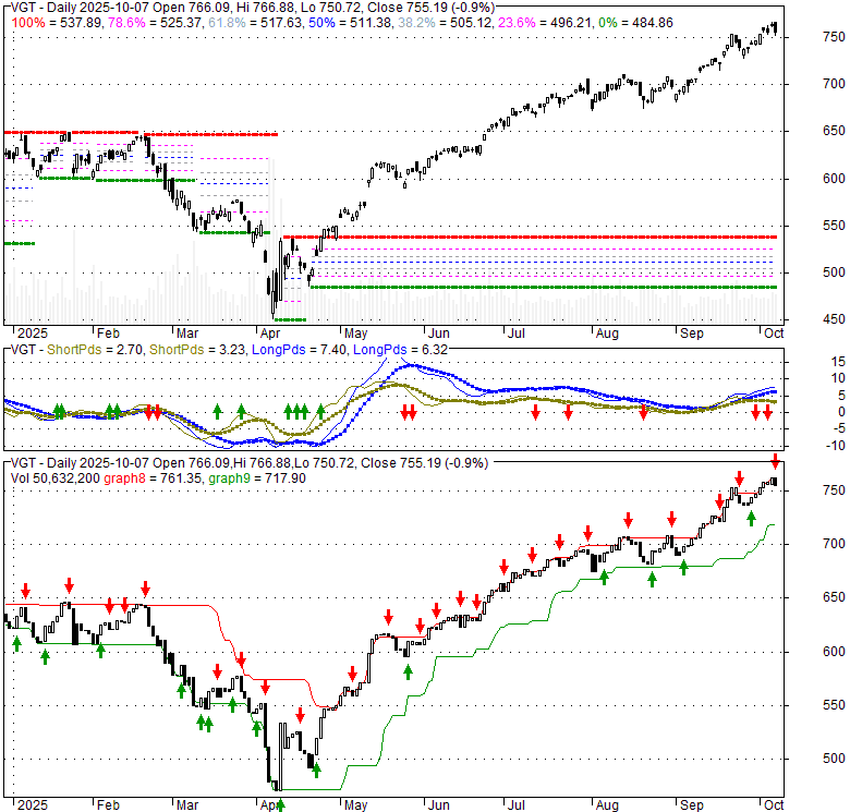 Price has closed below its short-term moving average. Short-term moving average is currently above mid-term; and above long-term moving average. From the relationship between price and moving averages: This stock is NEUTRAL in short-term; and BULLISH in mid-long term.[ VGT ] has closed below upper band by 26.9%. Bollinger Bands are 4.3% narrower than normal. The current width of the bands does not suggest anything about the future direction or movement of prices.