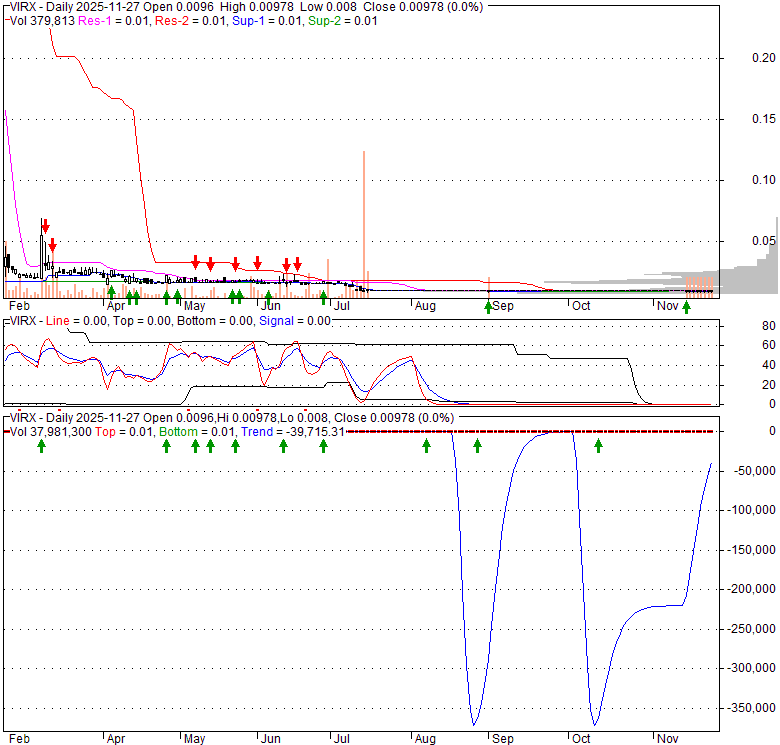 Price has closed below its short-term moving average. Short-term moving average is currently below mid-term; and below long-term moving average. From the relationship between price and moving averages: This stock is NEUTRAL in short-term; and NEUTRAL in mid-long term.[ VIRX ] has closed Bollinger Bands are 100% narrower than normal. The narrow width of the bands suggests low volatility as compared to its normal range. The bands have been in this narrow range for 85 bars. This is a sign that the market may be about to initiate a new trend.