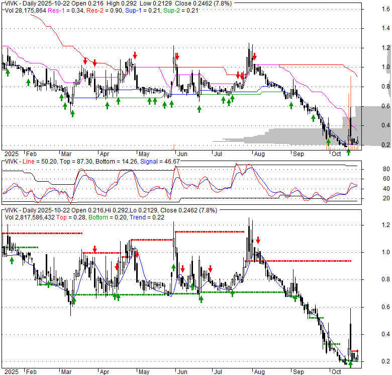 Price has closed above its short-term moving average. Short-term moving average is currently below mid-term; and below long-term moving average. From the relationship between price and moving averages: This stock is NEUTRAL in short-term; and BEARISH in mid-long term.[ VIVK ] has closed below upper band by 46.1%. Bollinger Bands are 48.8% narrower than normal. The narrow width of the bands suggests low volatility as compared to its normal range. The bands have been in this narrow range for 1 bars. This is a sign that the market may be about to initiate a new trend.