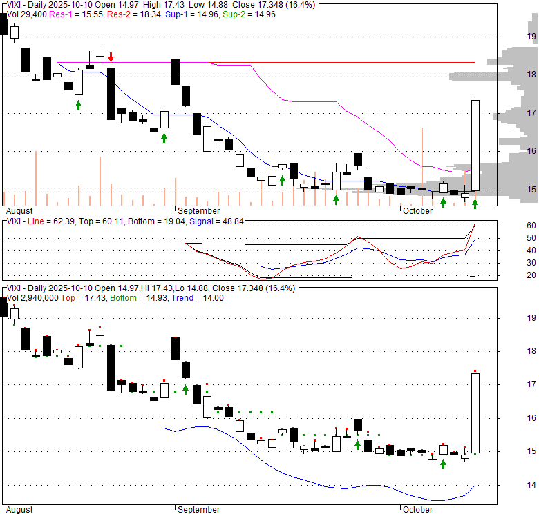 Price has closed above its short-term moving average. Short-term moving average is currently below mid-term; and below long-term moving average. From the relationship between price and moving averages: This stock is NEUTRAL in short-term; and NEUTRAL in mid-long term.[ VIXI ] has closed above the upper band by 36.2%. If price is in a uptrend band; this upward trend in price might continue. However a short term pullback inside the band is likely.Bollinger Bands are 0% narrower than normal.