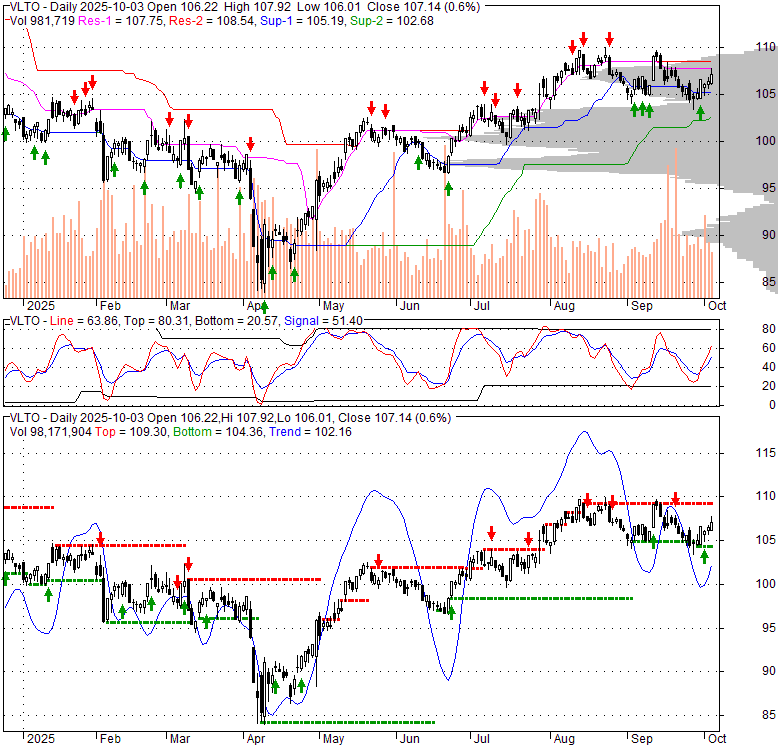 Price has closed above its short-term moving average. Short-term moving average is currently below mid-term; and above long-term moving average. From the relationship between price and moving averages: This stock is NEUTRAL in short-term; and NEUTRAL in mid-long term.[ VLTO ] has closed below upper band by 23.6%. Bollinger Bands are 34.9% narrower than normal. The current width of the bands does not suggest anything about the future direction or movement of prices.