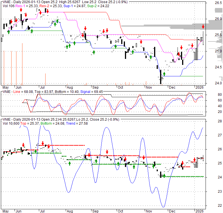 Price has closed below its short-term moving average. Short-term moving average is currently above mid-term; and above long-term moving average. From the relationship between price and moving averages: This stock is NEUTRAL in short-term; and NEUTRAL in mid-long term.[ VNIE ] has closed below upper band by 48.5%. Bollinger Bands are 19.6% narrower than normal. The current width of the bands does not suggest anything about the future direction or movement of prices.