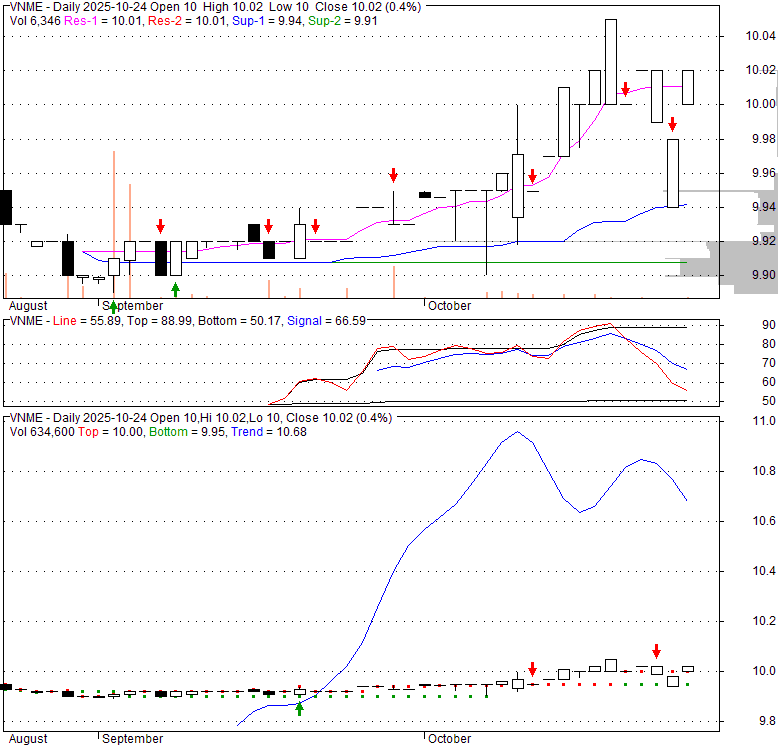 Price has closed above its short-term moving average. Short-term moving average is currently below mid-term; and below long-term moving average. From the relationship between price and moving averages: This stock is NEUTRAL in short-term; and NEUTRAL in mid-long term.[ VNME ] has closed below upper band by 26.9%. Bollinger Bands are 0% narrower than normal.
