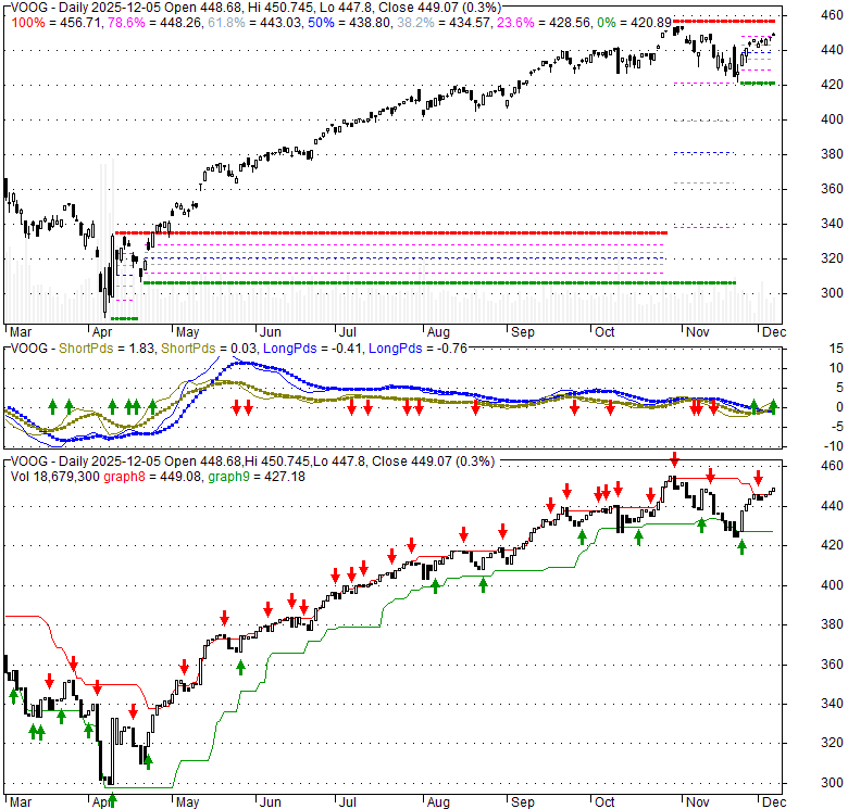 Price has closed above its short-term moving average. Short-term moving average is currently above mid-term; and above long-term moving average. From the relationship between price and moving averages: This stock is BULLISH in short-term; and BULLISH in mid-long term.[ VOOG ] has closed below upper band by 16.9%. Bollinger Bands are 60.8% wider than normal. The large width of the bands suggest high volatility as compared to its normal range. The bands have been in this wide range for 13 days. This is a sign that the current trend might continue.