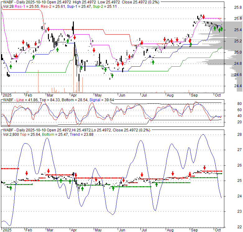 Price has closed above its short-term moving average. Short-term moving average is currently above mid-term; and above long-term moving average. From the relationship between price and moving averages: This stock is BULLISH in short-term; and BULLISH in mid-long term.[ WABF ] has closed below upper band by 41.8%. Bollinger Bands are 71.2% narrower than normal. The narrow width of the bands suggests low volatility as compared to its normal range. The bands have been in this narrow range for 11 bars. This is a sign that the market may be about to initiate a new trend.