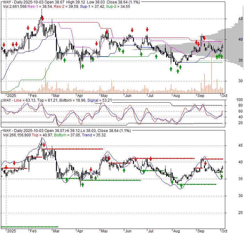 Price has closed above its short-term moving average. Short-term moving average is currently above mid-term; and above long-term moving average. From the relationship between price and moving averages: This stock is BULLISH in short-term; and NEUTRAL in mid-long term.[ WAY ] has closed below upper band by 11.9%. Bollinger Bands are 46.3% narrower than normal. The narrow width of the bands suggests low volatility as compared to its normal range. The bands have been in this narrow range for 2 bars. This is a sign that the market may be about to initiate a new trend.