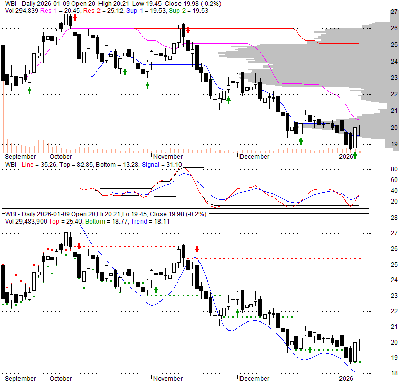 Price has closed above its short-term moving average. Short-term moving average is currently below mid-term; and below long-term moving average. From the relationship between price and moving averages: This stock is NEUTRAL in short-term; and NEUTRAL in mid-long term.[ WBI ] has closed below upper band by 42.3%. Bollinger Bands are 0% narrower than normal.