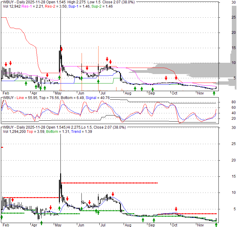 Price has closed above its short-term moving average. Short-term moving average is currently below mid-term; and below long-term moving average. From the relationship between price and moving averages: This stock is NEUTRAL in short-term; and BEARISH in mid-long term.[ WBUY ] has closed below upper band by 9.7%. Bollinger Bands are 49% narrower than normal. The narrow width of the bands suggests low volatility as compared to its normal range. The bands have been in this narrow range for 2 bars. This is a sign that the market may be about to initiate a new trend.