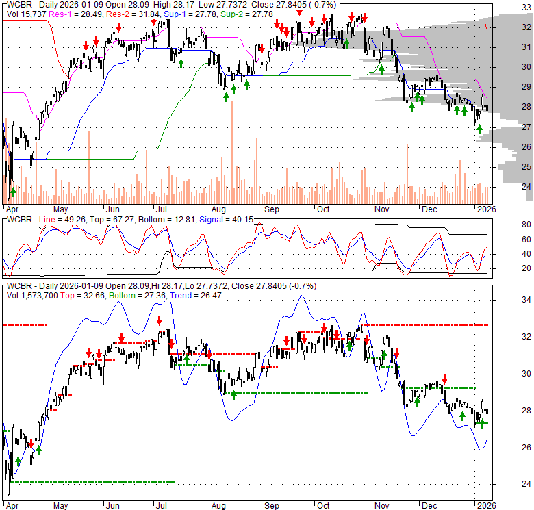 Price has closed above its short-term moving average. Short-term moving average is currently below mid-term; and below long-term moving average. From the relationship between price and moving averages: This stock is NEUTRAL in short-term; and BEARISH in mid-long term.[ WCBR ] has closed above bottom band by 44.8%. Bollinger Bands are 31% narrower than normal. The current width of the bands does not suggest anything about the future direction or movement of prices.