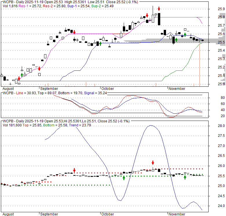 Price has closed above its short-term moving average. Short-term moving average is currently below mid-term; and below long-term moving average. From the relationship between price and moving averages: This stock is NEUTRAL in short-term; and NEUTRAL in mid-long term.[ WCPB ] has closed above bottom band by 47.8%. Bollinger Bands are 0% narrower than normal.