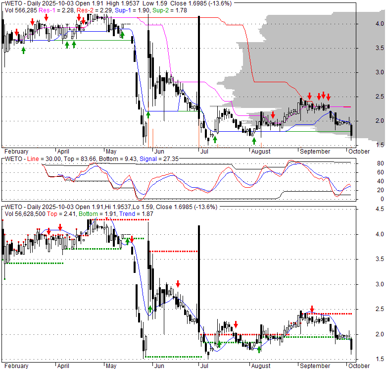 Price has closed below its short-term moving average. Short-term moving average is currently below mid-term; and below long-term moving average. From the relationship between price and moving averages: This stock is BEARISH in short-term; and BEARISH in mid-long term.[ WETO ] has closed below the lower bollinger band by 3.2%. Although price has broken the lower band and a downside breakout is possible; the most likely direction for [ WETO ] is to continue within current trading range. Bollinger Bands are 30.4% narrower than normal. The current width of the bands does not suggest anything about the future direction or movement of prices.