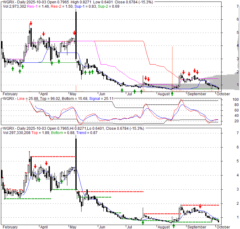 Price has closed below its short-term moving average. Short-term moving average is currently below mid-term; and below long-term moving average. From the relationship between price and moving averages: This stock is BEARISH in short-term; and BEARISH in mid-long term.[ WGRX ] has closed above bottom band by 7.7%. Bollinger Bands are 13.6% narrower than normal. The current width of the bands does not suggest anything about the future direction or movement of prices.