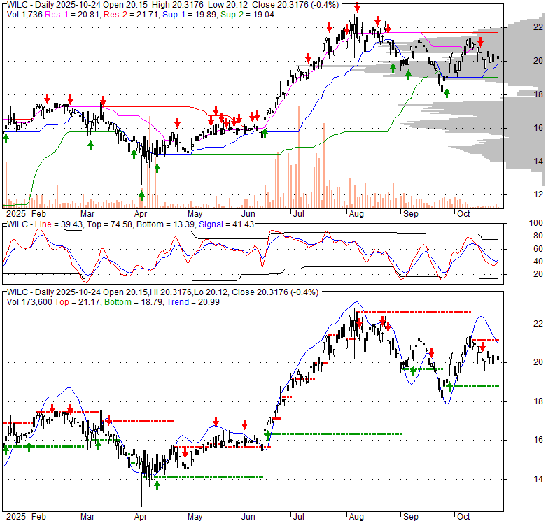Price has closed above its short-term moving average. Short-term moving average is currently below mid-term; and above long-term moving average. From the relationship between price and moving averages: This stock is NEUTRAL in short-term; and NEUTRAL in mid-long term.[ WILC ] has closed above bottom band by 42.6%. Bollinger Bands are 40.2% narrower than normal. The narrow width of the bands suggests low volatility as compared to its normal range. The bands have been in this narrow range for 0 bars. This is a sign that the market may be about to initiate a new trend.