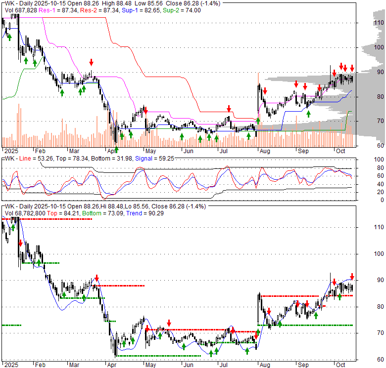 Price has closed below its short-term moving average. Short-term moving average is currently above mid-term; and above long-term moving average. From the relationship between price and moving averages: This stock is NEUTRAL in short-term; and BULLISH in mid-long term.[ WK ] has closed above bottom band by 39.5%. Bollinger Bands are 36.7% narrower than normal. The current width of the bands does not suggest anything about the future direction or movement of prices.