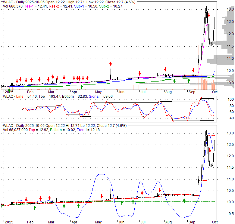 Price has closed above its short-term moving average. Short-term moving average is currently above mid-term; and above long-term moving average. From the relationship between price and moving averages: This stock is BULLISH in short-term; and BULLISH in mid-long term.[ WLAC ] has closed below upper band by 19.5%. Bollinger Bands are 420.8% wider than normal. The large width of the bands suggest high volatility as compared to its normal range. The bands have been in this wide range for 14 days. This is a sign that the current trend might continue.