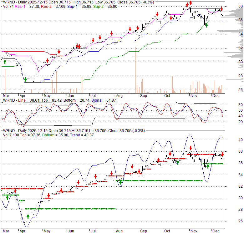 Price has closed below its short-term moving average. Short-term moving average is currently above mid-term; and above long-term moving average. From the relationship between price and moving averages: This stock is NEUTRAL in short-term; and BULLISH in mid-long term.[ WRND ] has closed above bottom band by 26.2%. Bollinger Bands are 25.9% narrower than normal. The current width of the bands does not suggest anything about the future direction or movement of prices.