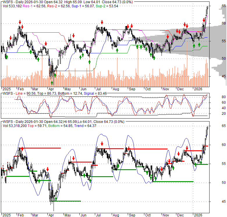 Price has closed above its short-term moving average. Short-term moving average is currently above mid-term; and above long-term moving average. From the relationship between price and moving averages: This stock is BULLISH in short-term; and BULLISH in mid-long term.[ WSFS ] has closed below upper band by 1.3%. Bollinger Bands are 201.2% wider than normal. The large width of the bands suggest high volatility as compared to its normal range. The bands have been in this wide range for 3 days. This is a sign that the current trend might continue.
