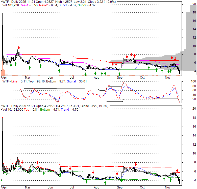 Price has closed below its short-term moving average. Short-term moving average is currently below mid-term; and below long-term moving average. From the relationship between price and moving averages: This stock is BEARISH in short-term; and NEUTRAL in mid-long term.[ WTF ] has closed below the lower bollinger band by 19.8%. If price is in a downtrend band; this downward trend might continue. However a short term pullback inside the band is likely. Bollinger Bands are 75.2% wider than normal. The large width of the bands suggest high volatility as compared to its normal range. The bands have been in this wide range for 0 days. This is a sign that the current trend might continue.