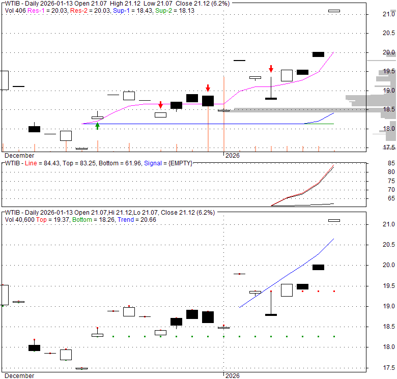 Price has closed above its short-term moving average. Short-term moving average is currently below mid-term; and below long-term moving average. From the relationship between price and moving averages: This stock is NEUTRAL in short-term; and NEUTRAL in mid-long term.[ WTIB ] has closed Bollinger Bands are 0% narrower than normal.