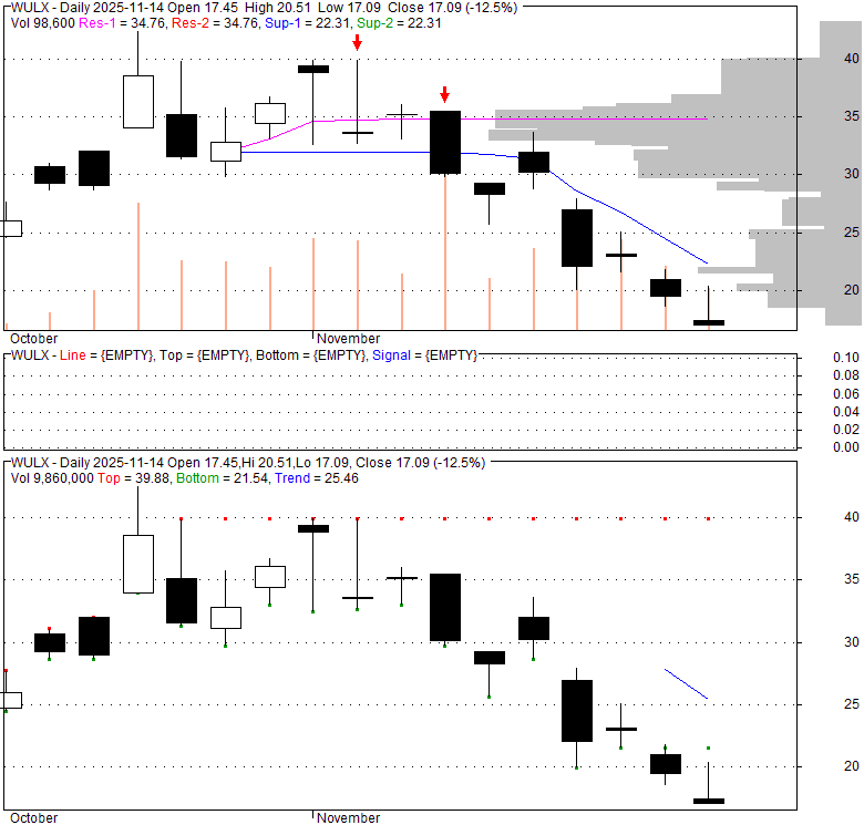 Price has closed below its short-term moving average. Short-term moving average is currently below mid-term; and below long-term moving average. From the relationship between price and moving averages: This stock is NEUTRAL in short-term; and NEUTRAL in mid-long term.[ WULX ] has closed above bottom band by 1.2%. Bollinger Bands are 0% narrower than normal.