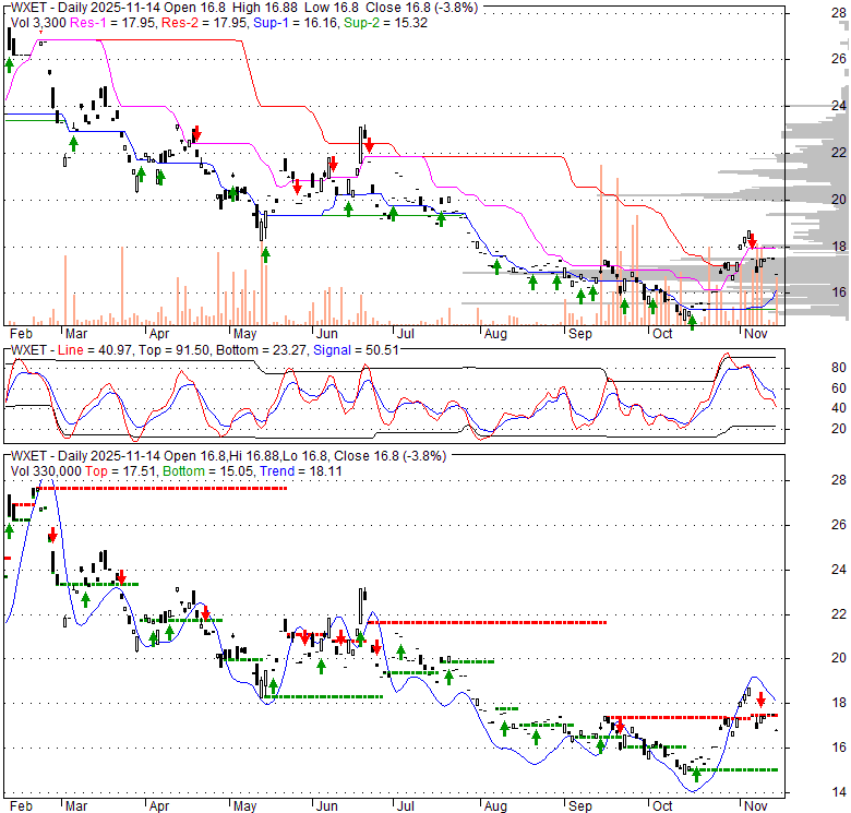 Price has closed below its short-term moving average. Short-term moving average is currently above mid-term; and below long-term moving average. From the relationship between price and moving averages: This stock is NEUTRAL in short-term; and NEUTRAL in mid-long term.[ WXET ] has closed above bottom band by 21.2%. Bollinger Bands are 4.8% narrower than normal. The current width of the bands does not suggest anything about the future direction or movement of prices.