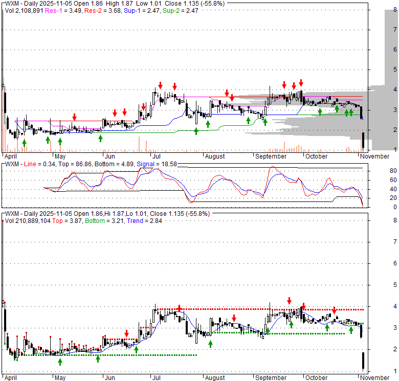 Price has closed below its short-term moving average. Short-term moving average is currently below mid-term; and below long-term moving average. From the relationship between price and moving averages: This stock is BEARISH in short-term; and NEUTRAL in mid-long term.[ WXM ] has closed below the lower bollinger band by 37.2%. If price is in a downtrend band; this downward trend might continue. However a short term pullback inside the band is likely. Bollinger Bands are 121% wider than normal. The large width of the bands suggest high volatility as compared to its normal range. The bands have been in this wide range for 0 days. This is a sign that the current trend might continue.