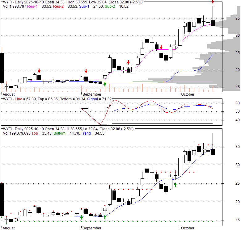 Price has closed below its short-term moving average. Short-term moving average is currently above mid-term; and below long-term moving average. From the relationship between price and moving averages: This stock is NEUTRAL in short-term; and NEUTRAL in mid-long term.[ WYFI ] has closed below upper band by 30.4%. Bollinger Bands are 0% narrower than normal.