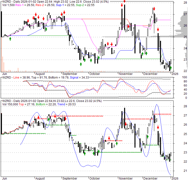 Price has closed above its short-term moving average. Short-term moving average is currently below mid-term; and below long-term moving average. From the relationship between price and moving averages: This stock is NEUTRAL in short-term; and NEUTRAL in mid-long term.[ WZRD ] has closed above bottom band by 37.9%. Bollinger Bands are 139.4% wider than normal. The large width of the bands suggest high volatility as compared to its normal range. The bands have been in this wide range for {EMPTY} days. This is a sign that the current trend might continue.