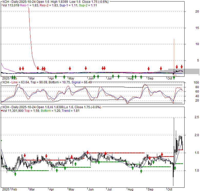 Price has closed below its short-term moving average. Short-term moving average is currently above mid-term; and above long-term moving average. From the relationship between price and moving averages: This stock is NEUTRAL in short-term; and BULLISH in mid-long term.[ XCH ] has closed below upper band by 35.8%. Bollinger Bands are 333.9% wider than normal. The large width of the bands suggest high volatility as compared to its normal range. The bands have been in this wide range for 10 days. This is a sign that the current trend might continue.