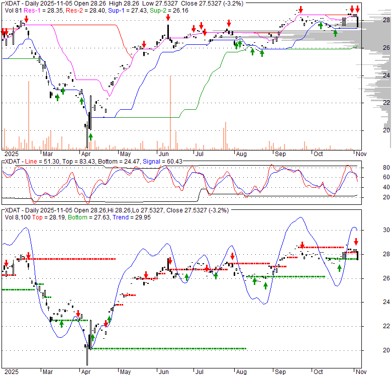 Price has closed below its short-term moving average. Short-term moving average is currently above mid-term; and above long-term moving average. From the relationship between price and moving averages: This stock is NEUTRAL in short-term; and BULLISH in mid-long term.[ XDAT ] has closed above bottom band by 25.9%. Bollinger Bands are 28.8% wider than normal. The current width of the bands does not suggest anything about the future direction or movement of prices.