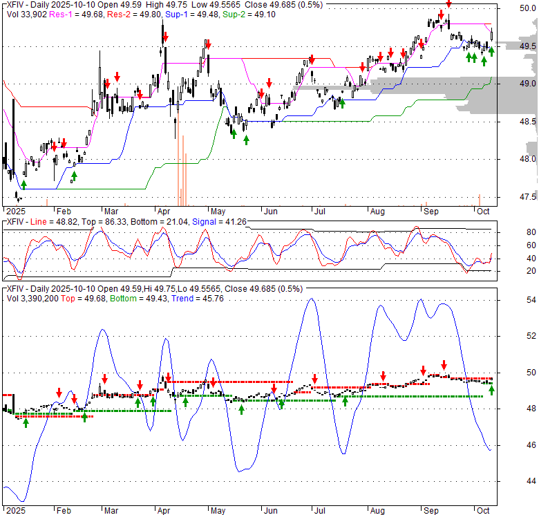 Price has closed above its short-term moving average. Short-term moving average is currently below mid-term; and above long-term moving average. From the relationship between price and moving averages: This stock is NEUTRAL in short-term; and NEUTRAL in mid-long term.[ XFIV ] has closed below upper band by 3.9%. Bollinger Bands are 46.3% narrower than normal. The narrow width of the bands suggests low volatility as compared to its normal range. The bands have been in this narrow range for 3 bars. This is a sign that the market may be about to initiate a new trend.