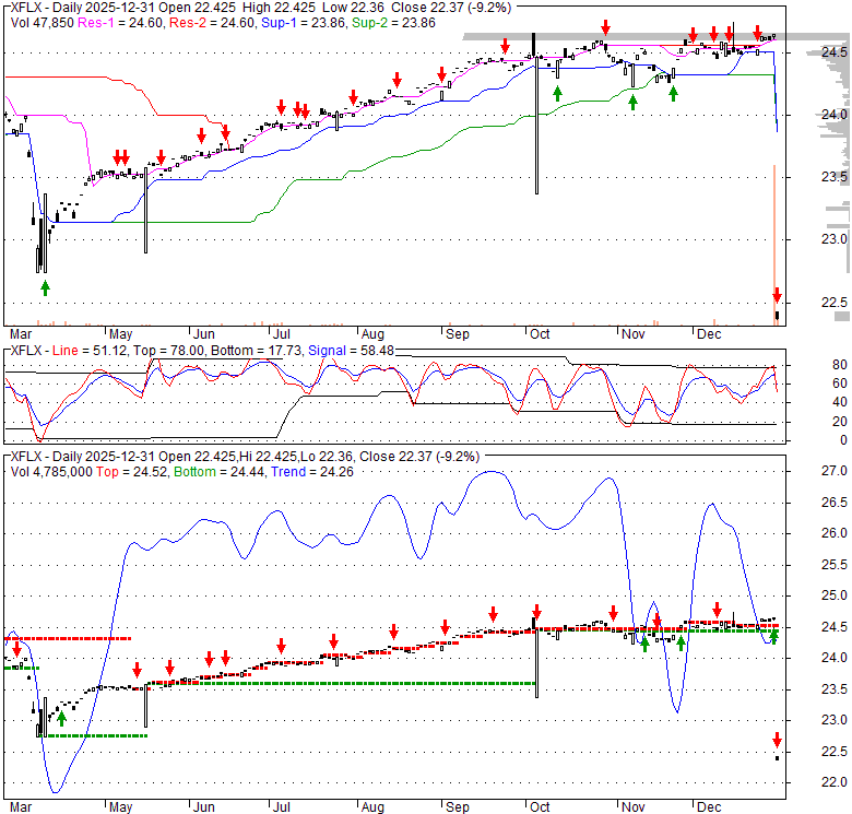 Price has closed below its short-term moving average. Short-term moving average is currently below mid-term; and below long-term moving average. From the relationship between price and moving averages: This stock is BEARISH in short-term; and NEUTRAL in mid-long term.[ XFLX ] has closed below the lower bollinger band by 43.2%. If price is in a downtrend band; this downward trend might continue. However a short term pullback inside the band is likely. Bollinger Bands are 746.8% wider than normal. The large width of the bands suggest high volatility as compared to its normal range. The bands have been in this wide range for 0 days. This is a sign that the current trend might continue.