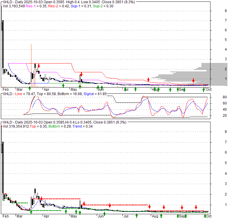 Price has closed above its short-term moving average. Short-term moving average is currently above mid-term; and below long-term moving average. From the relationship between price and moving averages: This stock is BULLISH in short-term; and NEUTRAL in mid-long term.[ XHLD ] has closed above the upper band by 9.5%. If price is in a uptrend band; this upward trend in price might continue. However a short term pullback inside the band is likely.Bollinger Bands are 55% narrower than normal. The narrow width of the bands suggests low volatility as compared to its normal range. The bands have been in this narrow range for {EMPTY} bars. This is a sign that the market may be about to initiate a new trend.