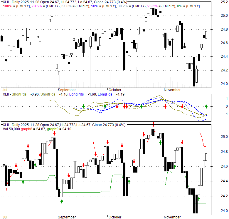 Price has closed above its short-term moving average. Short-term moving average is currently below mid-term; and below long-term moving average. From the relationship between price and moving averages: This stock is NEUTRAL in short-term; and NEUTRAL in mid-long term.[ XLII ] has closed below upper band by 24.9%. Bollinger Bands are 0% narrower than normal.